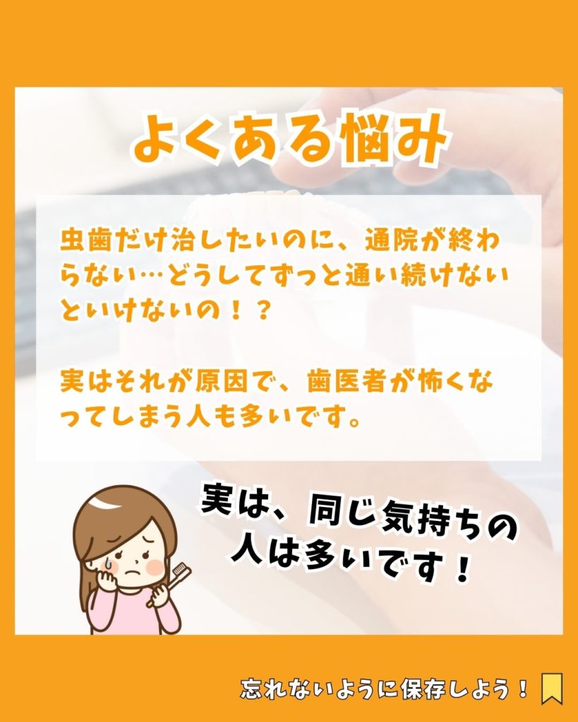 • 虫歯を治したいだけなのに、どうしていつまでも通院が終わらないの!?どうして次の通院を薦めてくるの!?という方はぜひご覧く