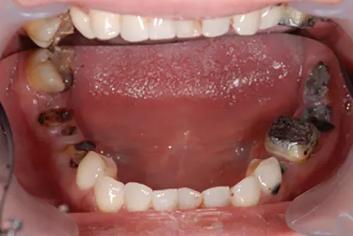 | 治療の内容 | 片顎インプラント治療4歯、骨造成、セラミックポンテック2歯(ブリッジ)、ホームホワイトニングによる総合治療。 |