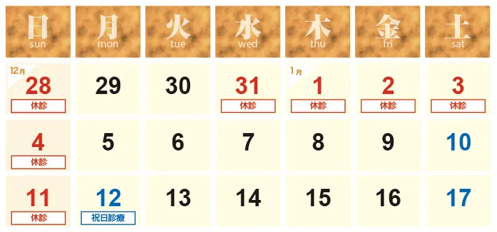 2025年12月31日(水)〜2026年1月4日(日)は誠に勝手ながら休診とさせていただきます。